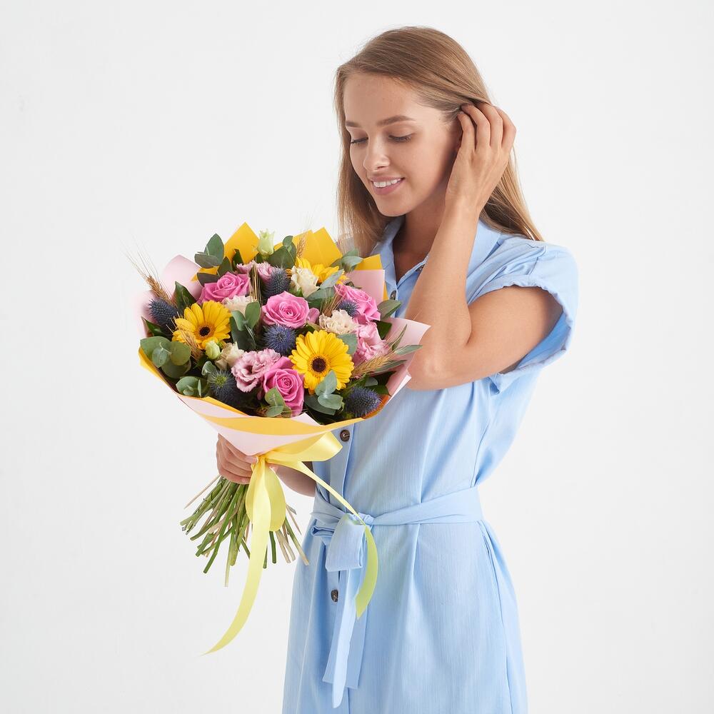 Яркий и стильный букет из розовых роз сорта Аква, желтых мини гербер, бело-розового лизиантуса, веточек эрингиума и эвкалипта, колосьев и зелени. Букет упакован в стильный крафт и перевязан атласной лентой.